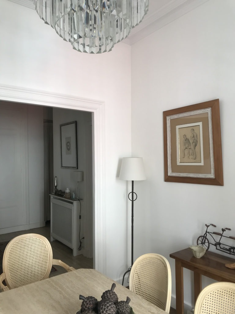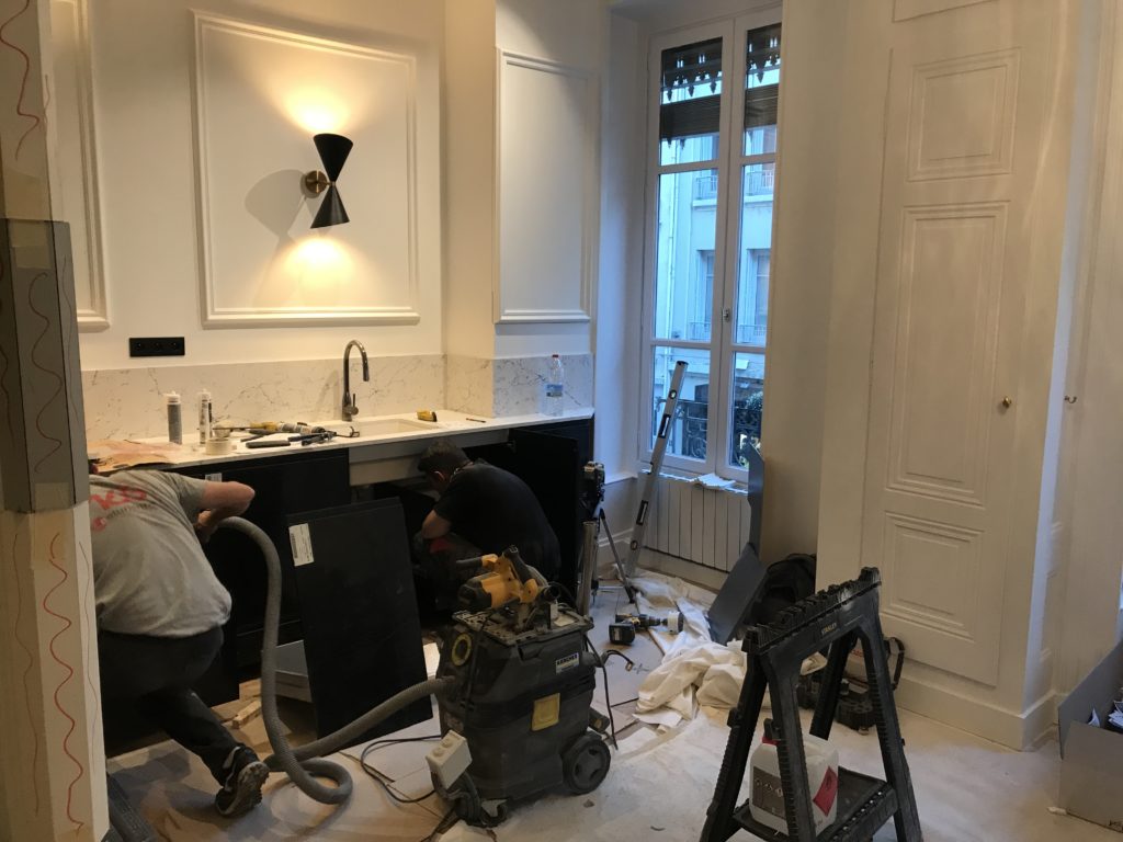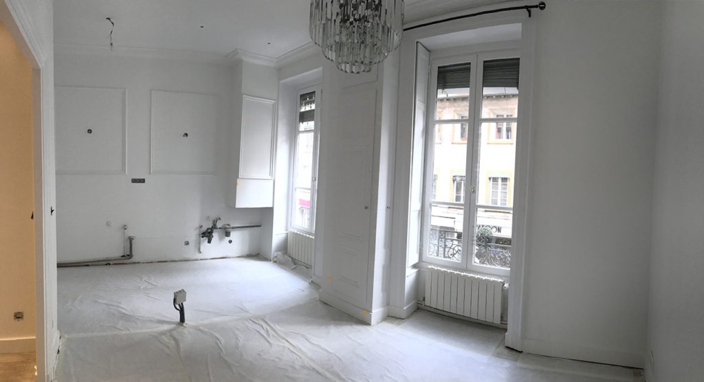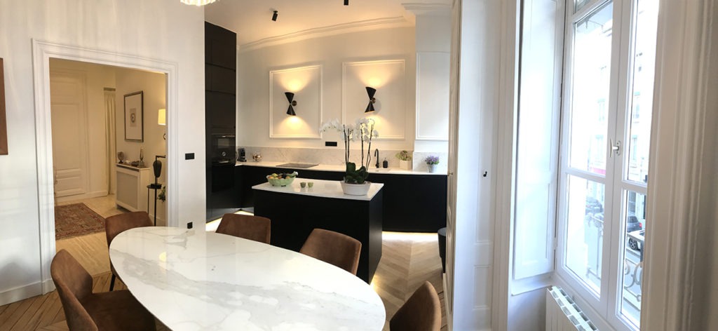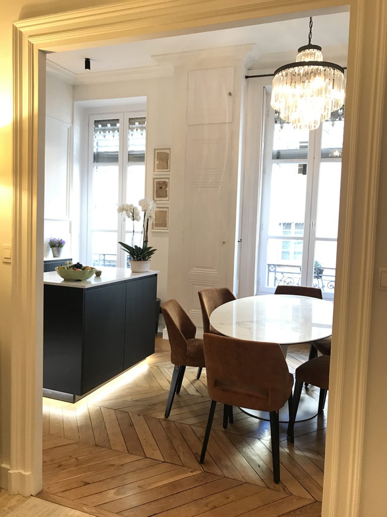 On nous a confiés la rénovation d’un séjour cuisine d’un bel appartement Haussmannien dans Lyon 6ème. Beau chantier avec la suppression de la cloison entre la cuisine et la salle à manger, le prolongement du parquet point de Hongrie à la place du carrelage et la reconstitution des moulures à l’identique par un staffeur. L’accès à la cuisine depuis l’entrée a été supprimé.
