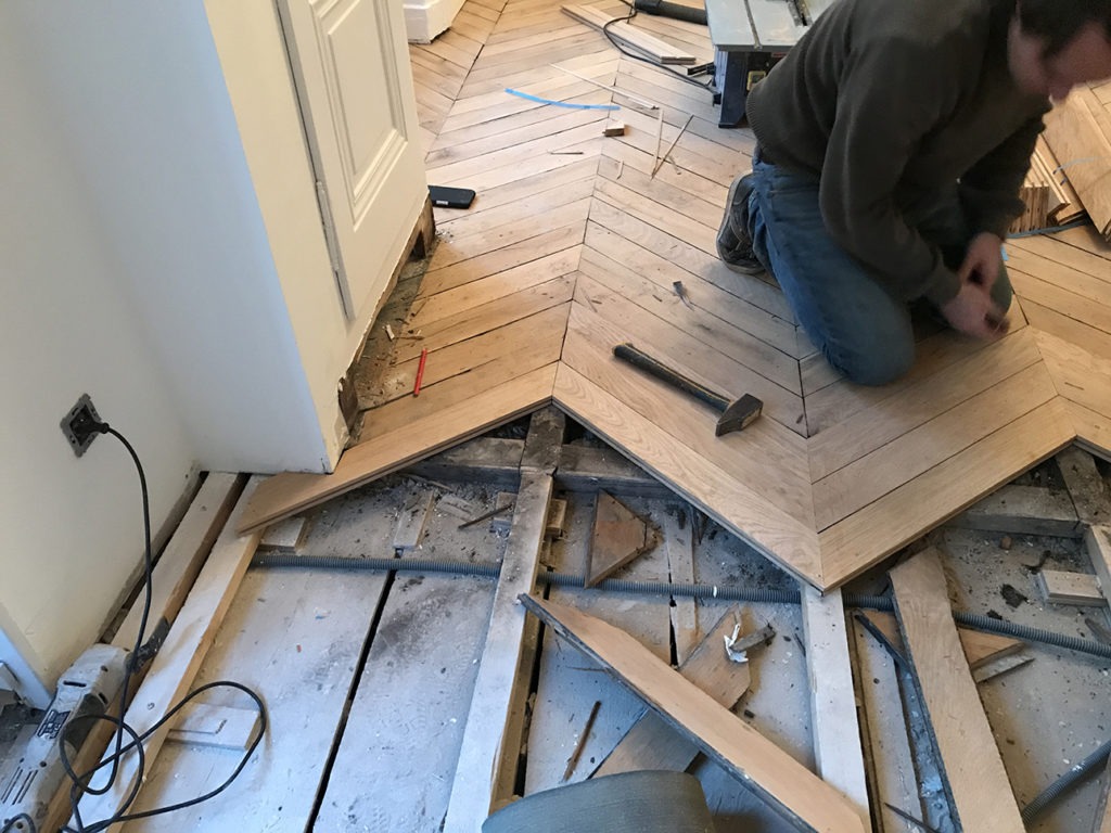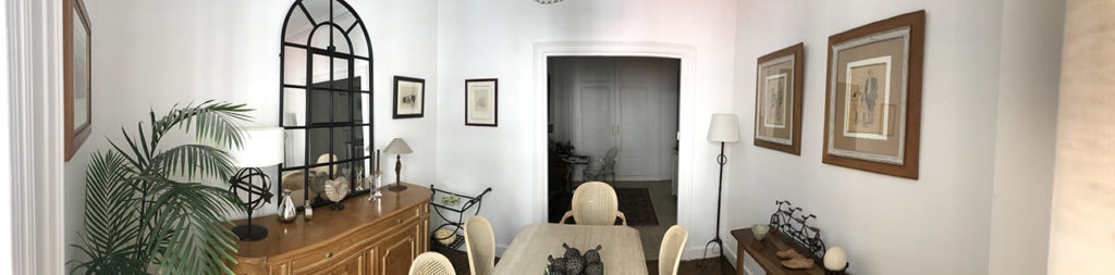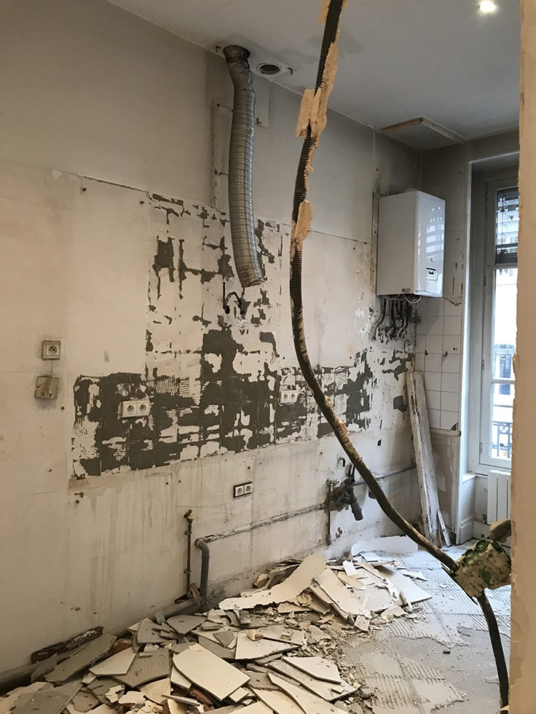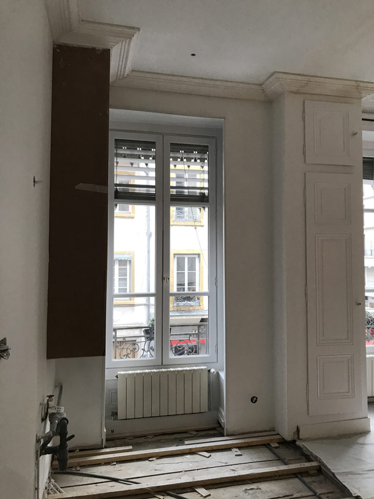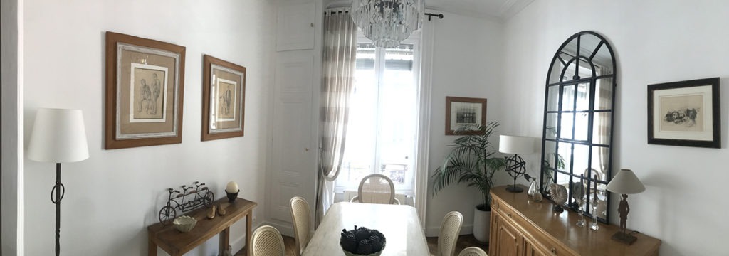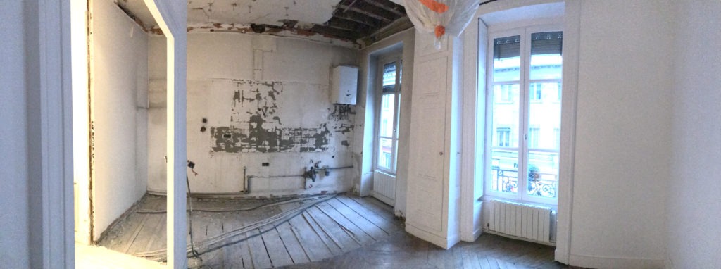 On nous a confiés la rénovation d’un séjour cuisine d’un bel appartement Haussmannien dans Lyon 6ème. Beau chantier avec la suppression de la cloison entre la cuisine et la salle à manger, le prolongement du parquet point de Hongrie à la place du carrelage et la reconstitution des moulures à l’identique par un staffeur. L’accès à la cuisine depuis l’entrée a été supprimé.