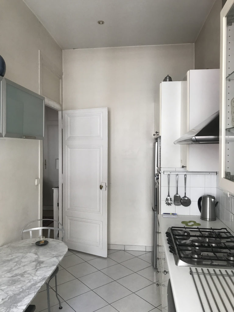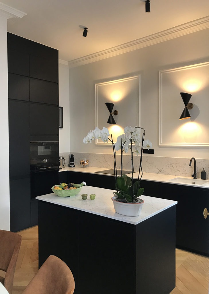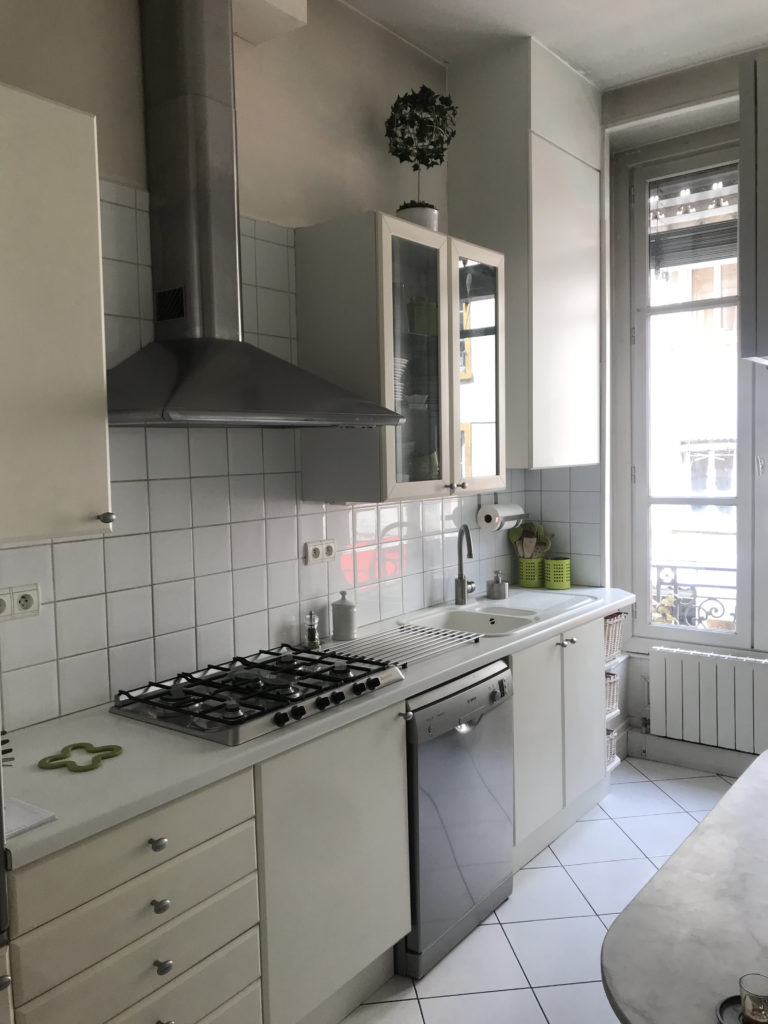 Souhait de la cliente : une cuisine contemporaine et minimaliste en conservant l’esprit de l’appartement.