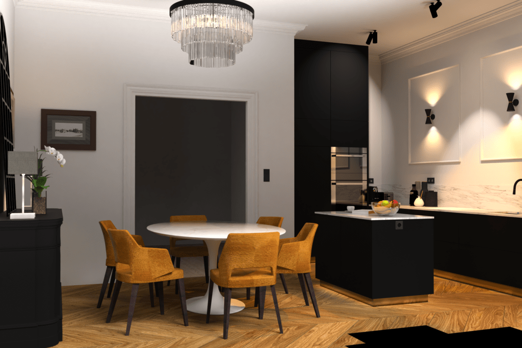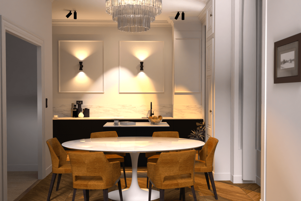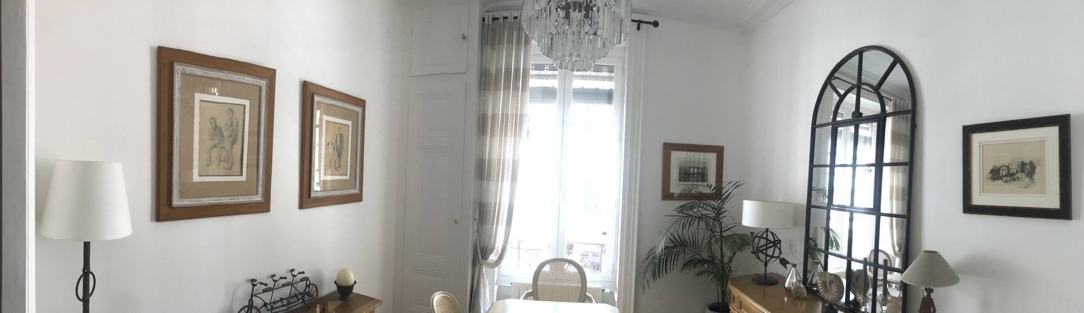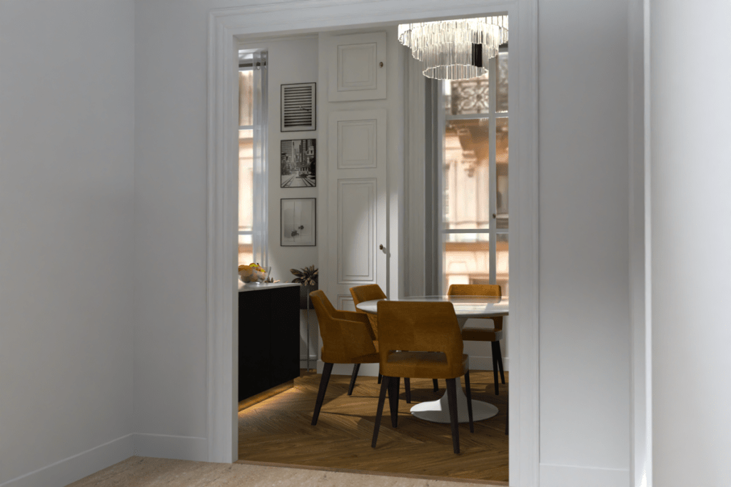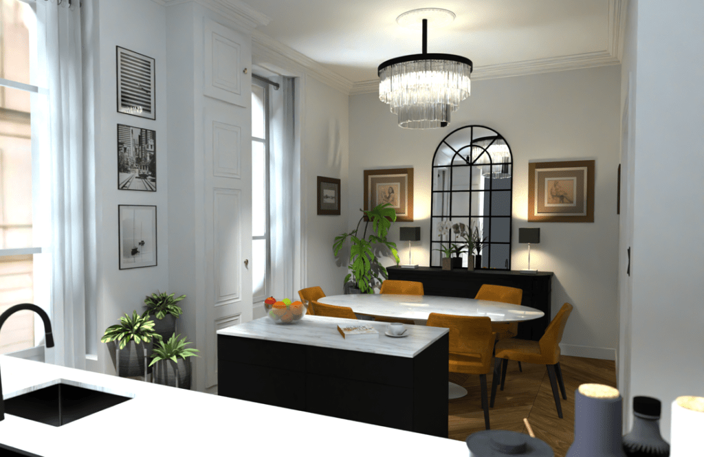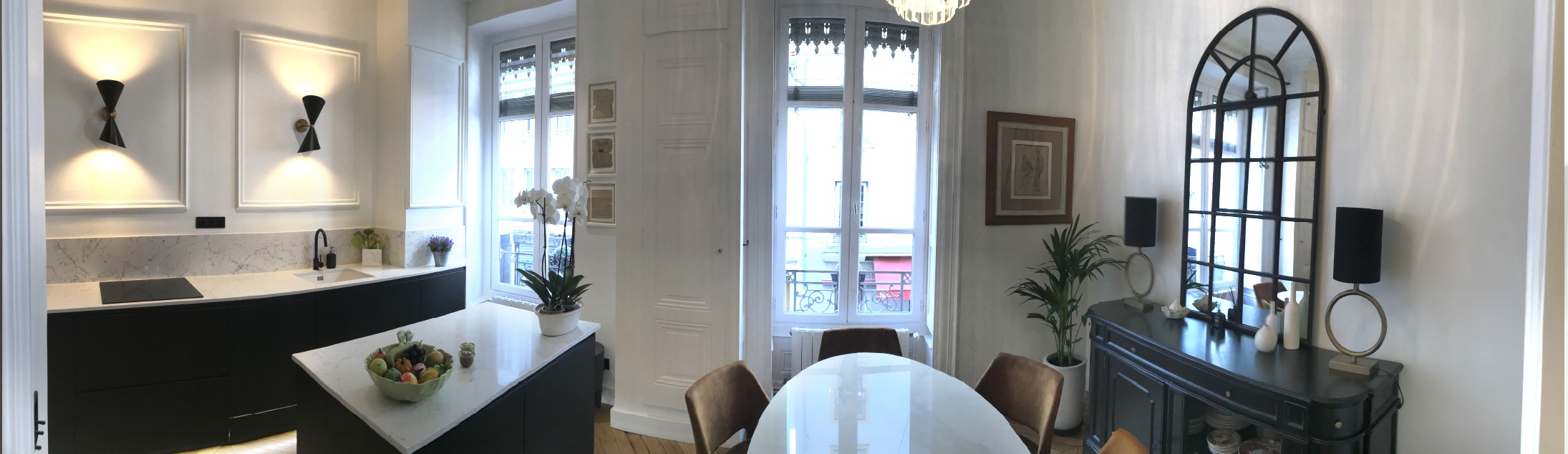 On nous a confiés la rénovation d’un séjour cuisine d’un bel appartement Haussmannien dans Lyon 6ème. Beau chantier avec la suppression de la cloison entre la cuisine et la salle à manger, le prolongement du parquet point de Hongrie à la place du carrelage et la reconstitution des moulures à l’identique par un staffeur. L’accès à la cuisine depuis l’entrée a été supprimé.